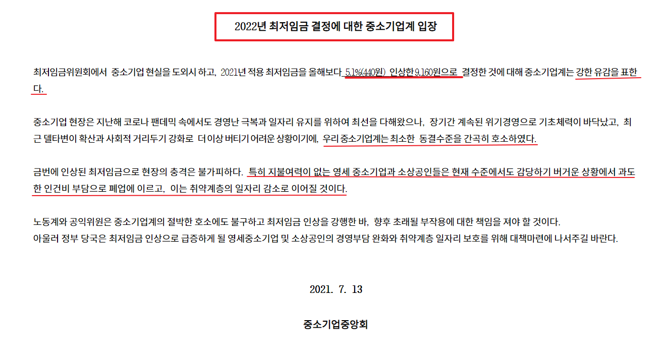 2022년 최저임금 결정에 대한 중소기업계 입장 전문